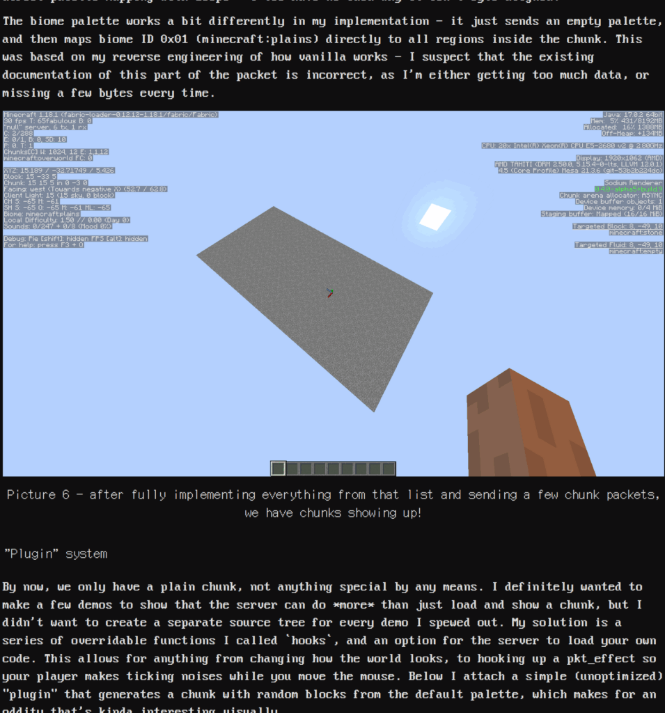 This shouldn’t be mistaken as producing a useable Minecraft server, suitable for hanging out with your friends, building blocky castles and fleeing from creepers in. As much as I can gather, it produces the bare minimum needed to connect to the game. And it cheats slightly by using awk to handle loops and some numbers. But much of the point of bash is to connect other tools together into a data flow, so I’ma allow it.