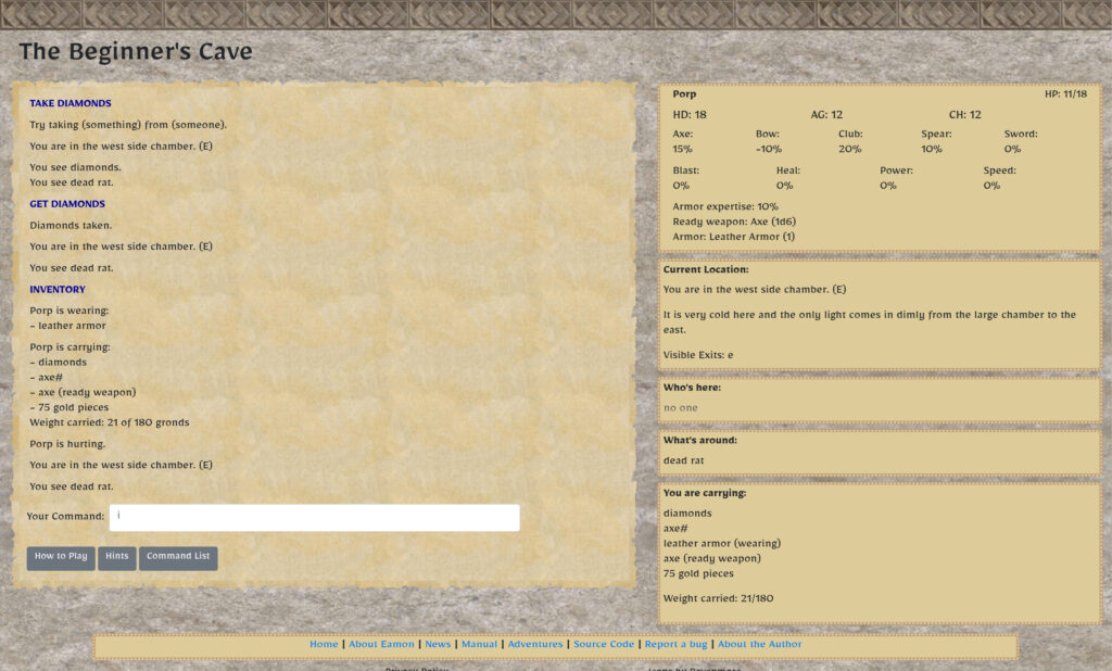 The “Beginners Cave” adventure is the intended first experience with EAMON. It provides you with some basic treasure, opponents and advancement. It is quite possible for a new character to die there, so treat this adventure with care. I found that there’s some quirks. “take [item]” tends not to work; “get [item],” however, does. “attack [monster]” can be used to attack in melee. There is a button, by the input box, that you can click for a list of available commands.