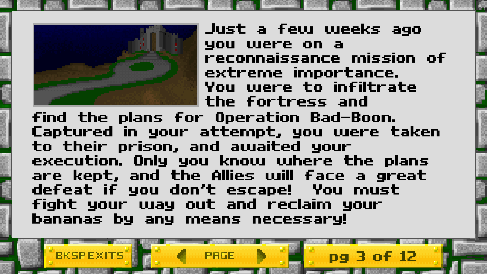 There’s only eight levels (at least in the first “episode”) so it doesn’t take long to get through either. In the first version they kept Wolfenstein 3D’s graphics unchanged, meaning unfortunate reminders of Bad Person and his Stupid Symbol. Those have been removed since, which makes it less accurate to Wolf3D but also less saddening to play.