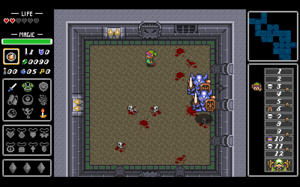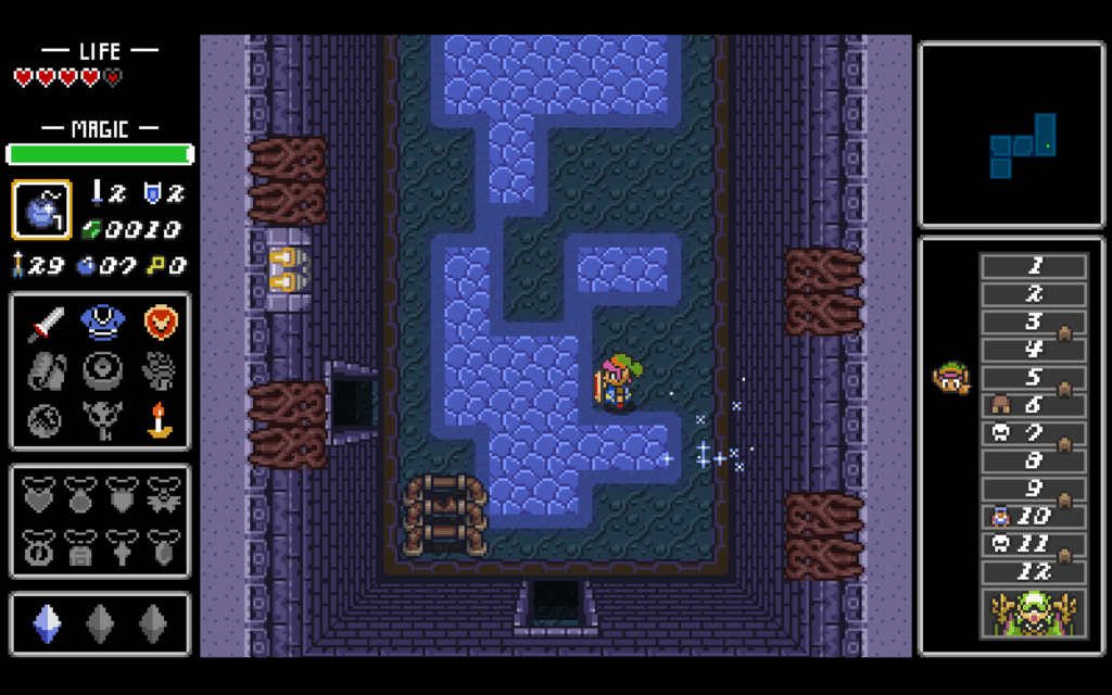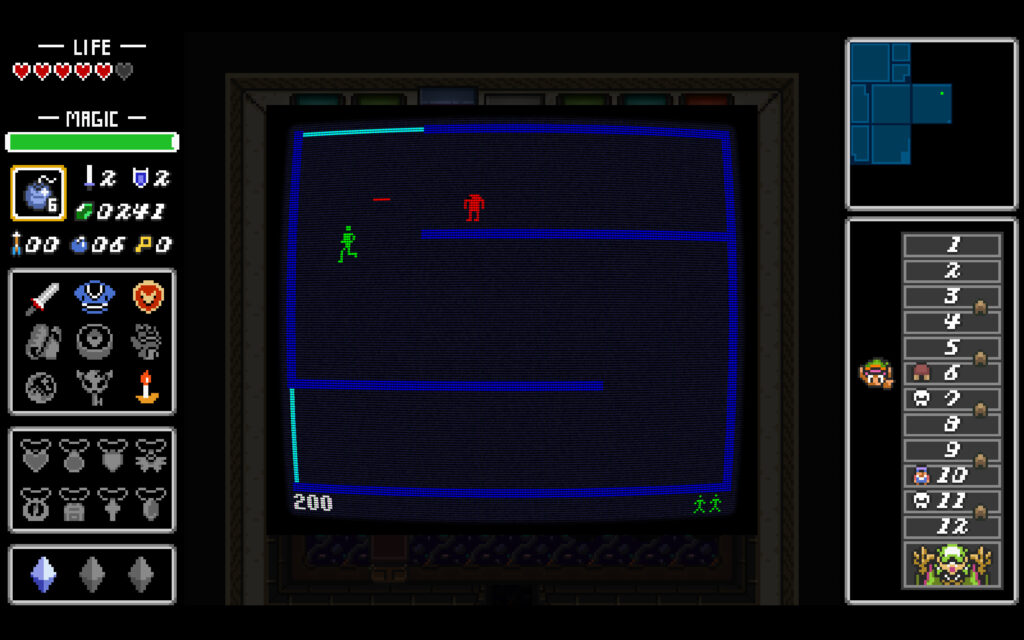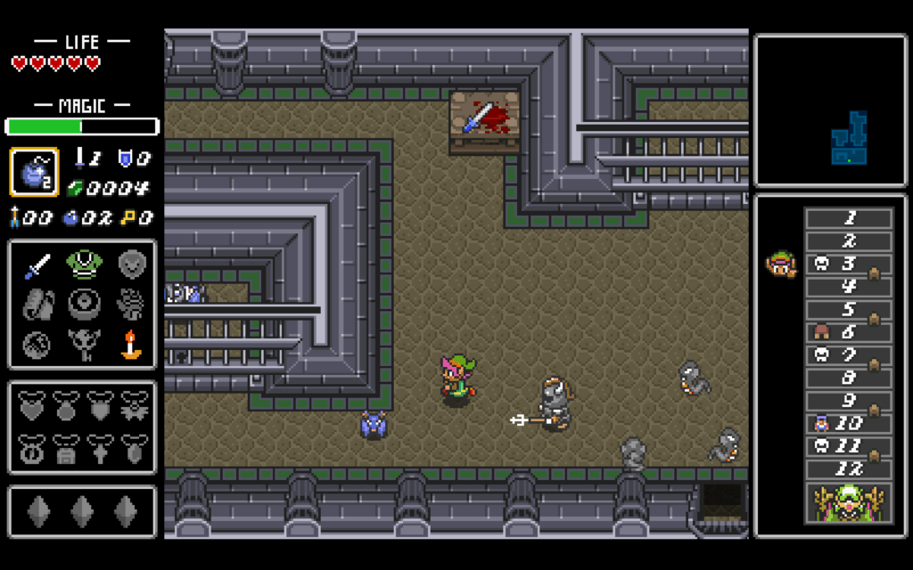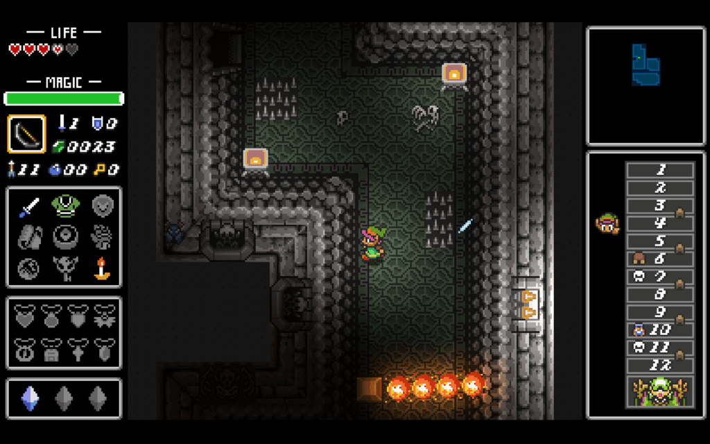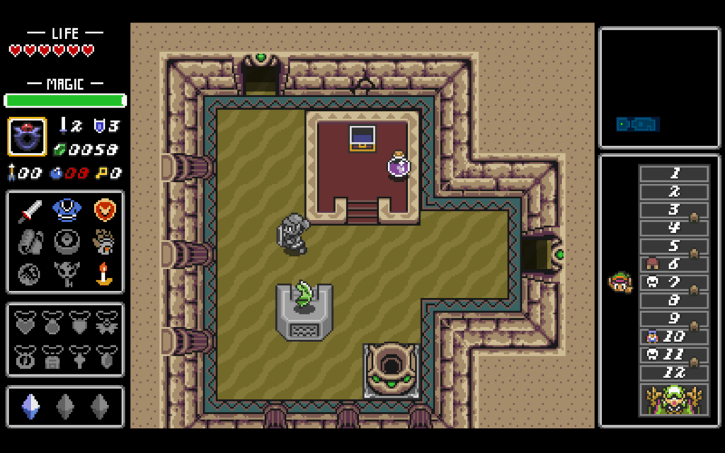 So the idea is, like in the other games in the series of, um, The Saga of Fitzgerald’s Wife, is to pilot a green-suited elf kid through dangerous and tricky dungeons and caverns full of monsters and traps, collecting items and uncovering secrets. What’s different is that the game is much more linear than those other games (much like the Four Swords Adventures titles), and the rooms and their arrangements are randomly determined. So… also like the Four Swords Adventures games, although this one is purely for solo play.