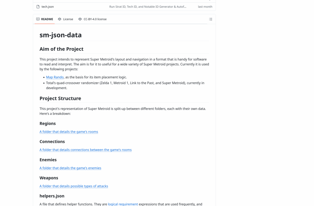 If you explore the internet long enough, you find wonders and horrors, but you also find very weird and obsessive things. One such thing is sm-json-data, a project to not only comprehensive catalog all of the tricks in Super Metroid and the situations they apply to and their uses, but to express it in a machine-readable fashion, so randomizers can use it.